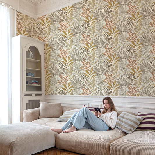 GRANDECO KARA TROPICAL JUNGLE FOLIAGE LEAVES BEIGE WALLPAPER
