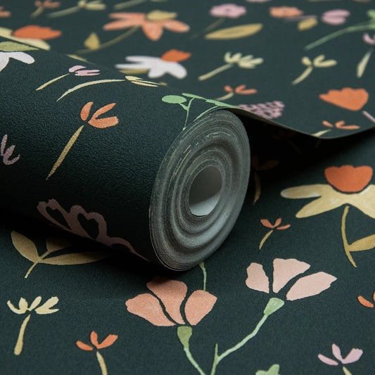 GRANDECO NAIVE GARDEN DITSY FLOWERS GREEN WALLPAPER