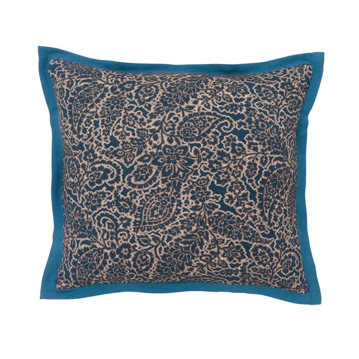 Go bold with Aldin, a horizontal stripe design in multi-colour tones of blues, celadon green, teal and yellow. Complete the look with the navy poly velvet square pillowcase and coordinating throw with cotton slub edging on all four sides. The paisley pattern cushion adds a sophisticated finish.