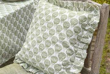 Square cushion in olive carnation print. Finished with a ruffle flange. Zip closure for easy removal of the pad.