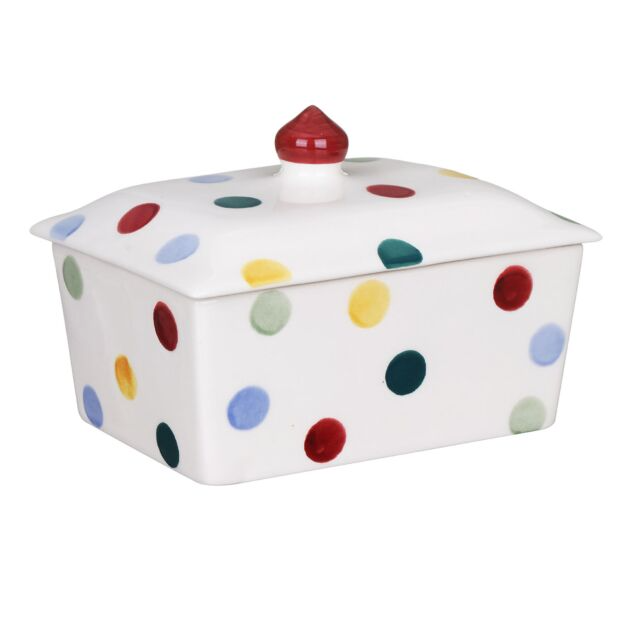 Made from creamy ceramic ware, this fine china butter dish from Emma Bridgewater is embellished with multi-coloured dots in soft shades of red, green, yellow and blue. Perfectly sized to fit a standard pack of butter, the dish has a lid with a knob in the centre, so buttery fingers won’t drop it! Not only is this a lovely piece to compliment your kitchen, you will be saving the environment by not buying butter in plastic tubs, and don’t forget to use the wrapper to grease your baking tins! This butter dish is a lovely piece which will complement any collection of Emma Bridgewater pieces. It makes a lovely gift for a new home, a birthday, Mother’s Day or any occasion.