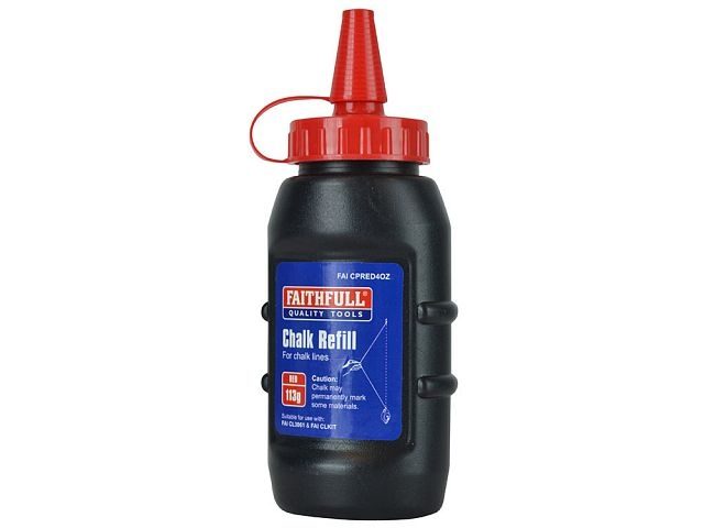Brightly coloured chalk powder refills for use with chalk line reels, in handy nozzle-cap squeezy bottles with easy pouring spout. Suitable for both interior and exterior use.