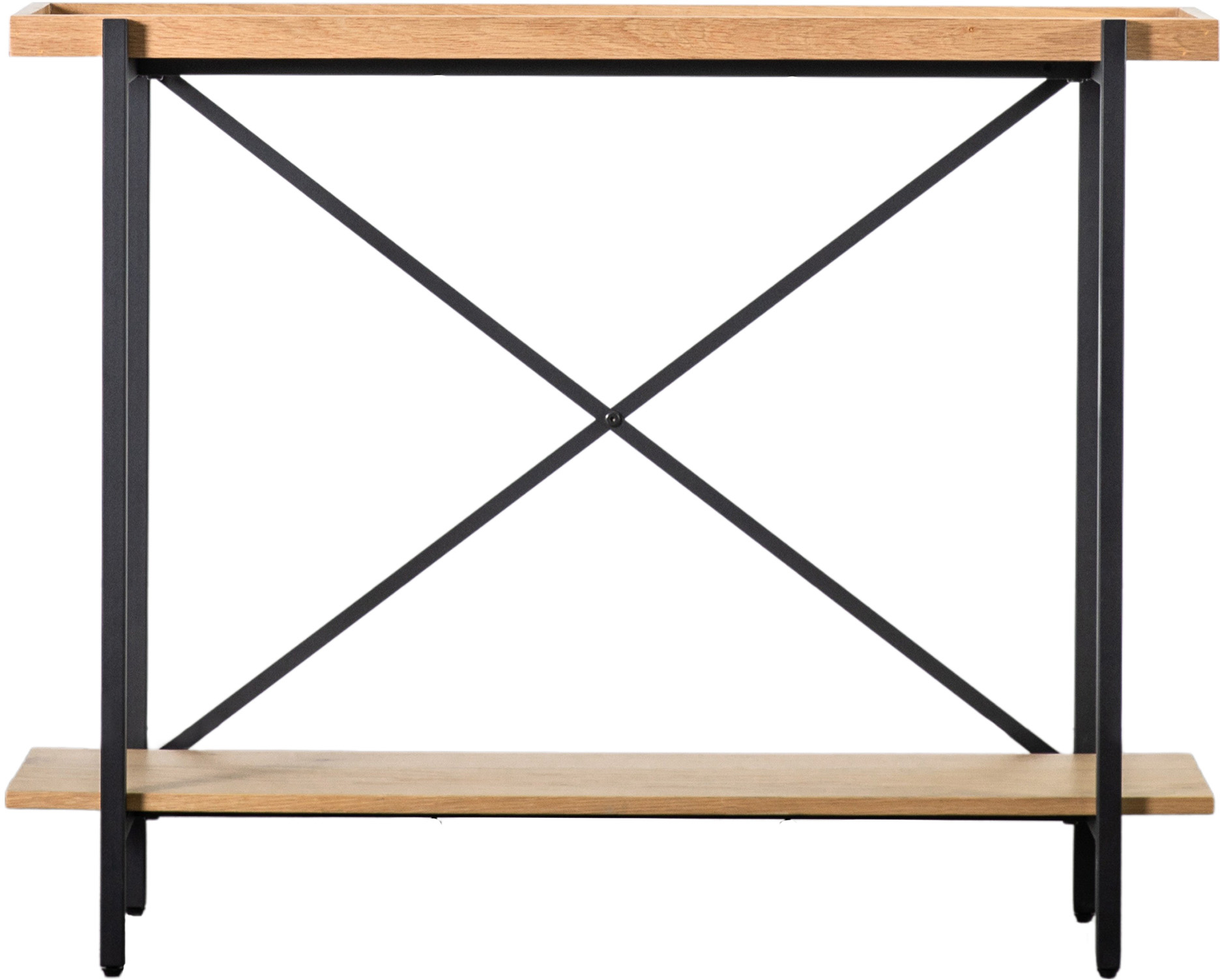 Offering a stunning contemporary look, this console table combines matt black metal with oak. The table top and shelf are tray-style with oak veneer tops and solid oak surrounds.