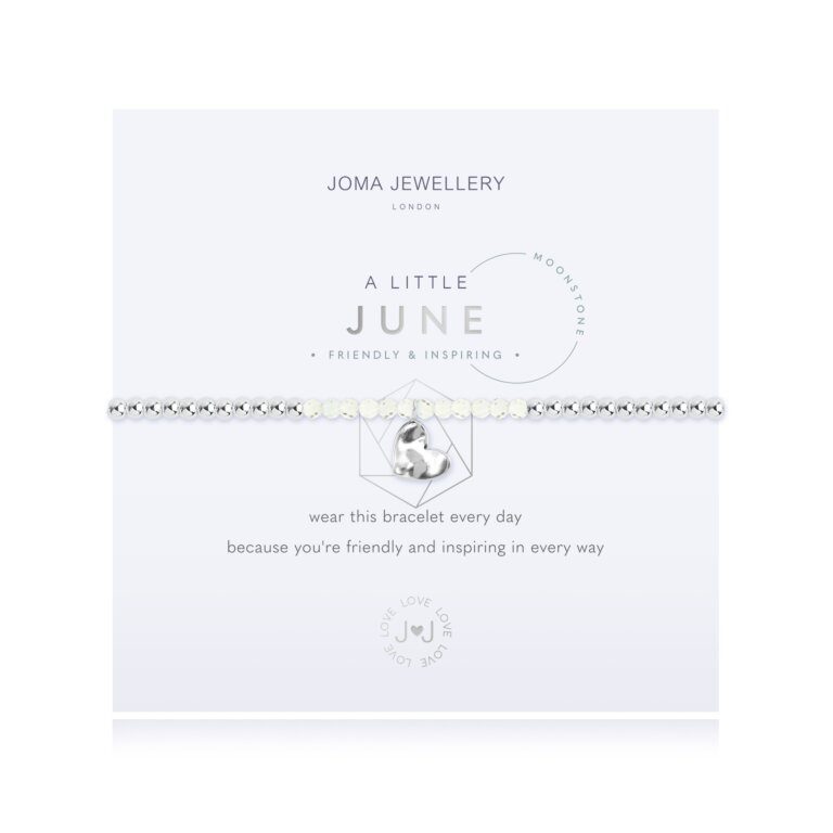 Searching for that perfect gift for the June baby in your life? Our June 'A Little' Birthstone Bracelet is threaded with semi-precious Moonstone and accompanied by a poem that celebrates the unique characteristics of the birthday girl. Decorated with a gently hammered silver heart charm and wrapped around a stylised card, this treasure makes for the most thoughtful gift imaginable.
