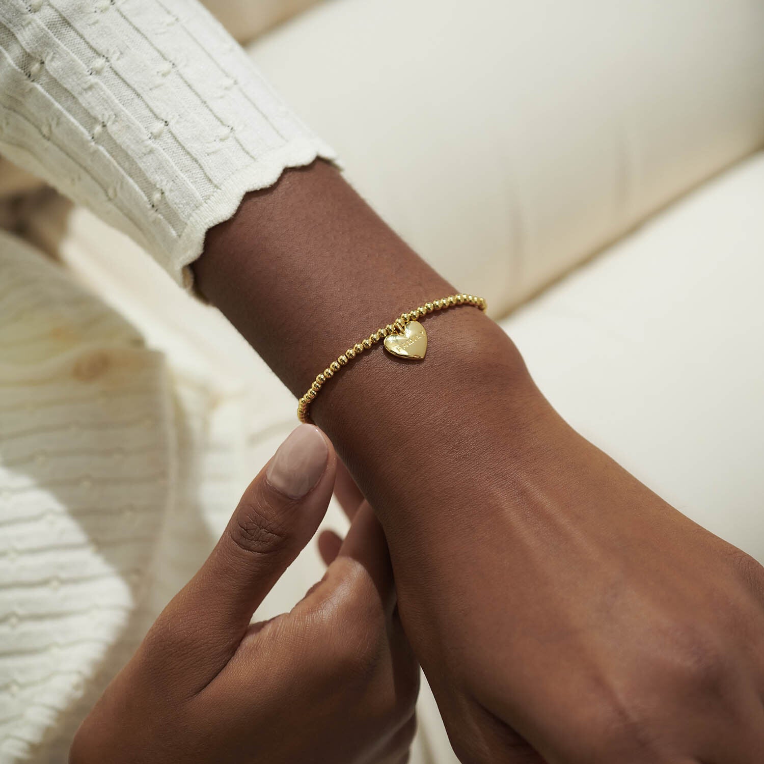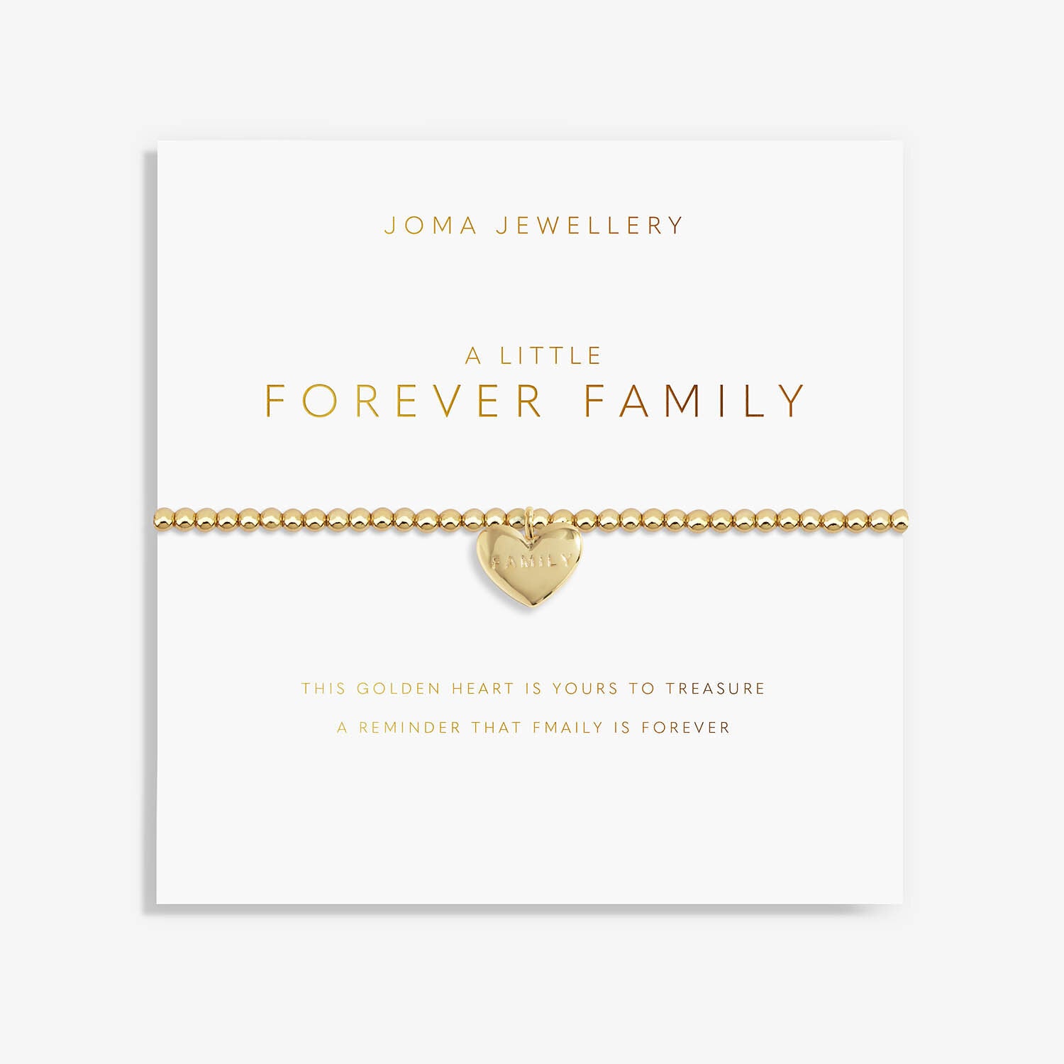 Go for Gold with our Golden Glow Collection. This A Little 'Forever Family' Bracelet features a Gold-Plated stretch-bead design with a sparkling heart-shaped pendant that shimmers with every movement. As always, this piece is beautifully presented on a stylised card which has been stamped with a heartfelt poem, ready to create an unforgettable gifting moment.