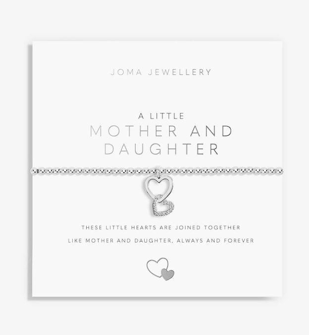 Our A Little 'Mother And Daughter' Bracelet features a silver-plated design that will dazzle with every movement. Featuring a silver stretch-bead style and a sparkling interlocked heart-shaped charm, wrapped around one of our stylised cards and framed by a sweet poem.