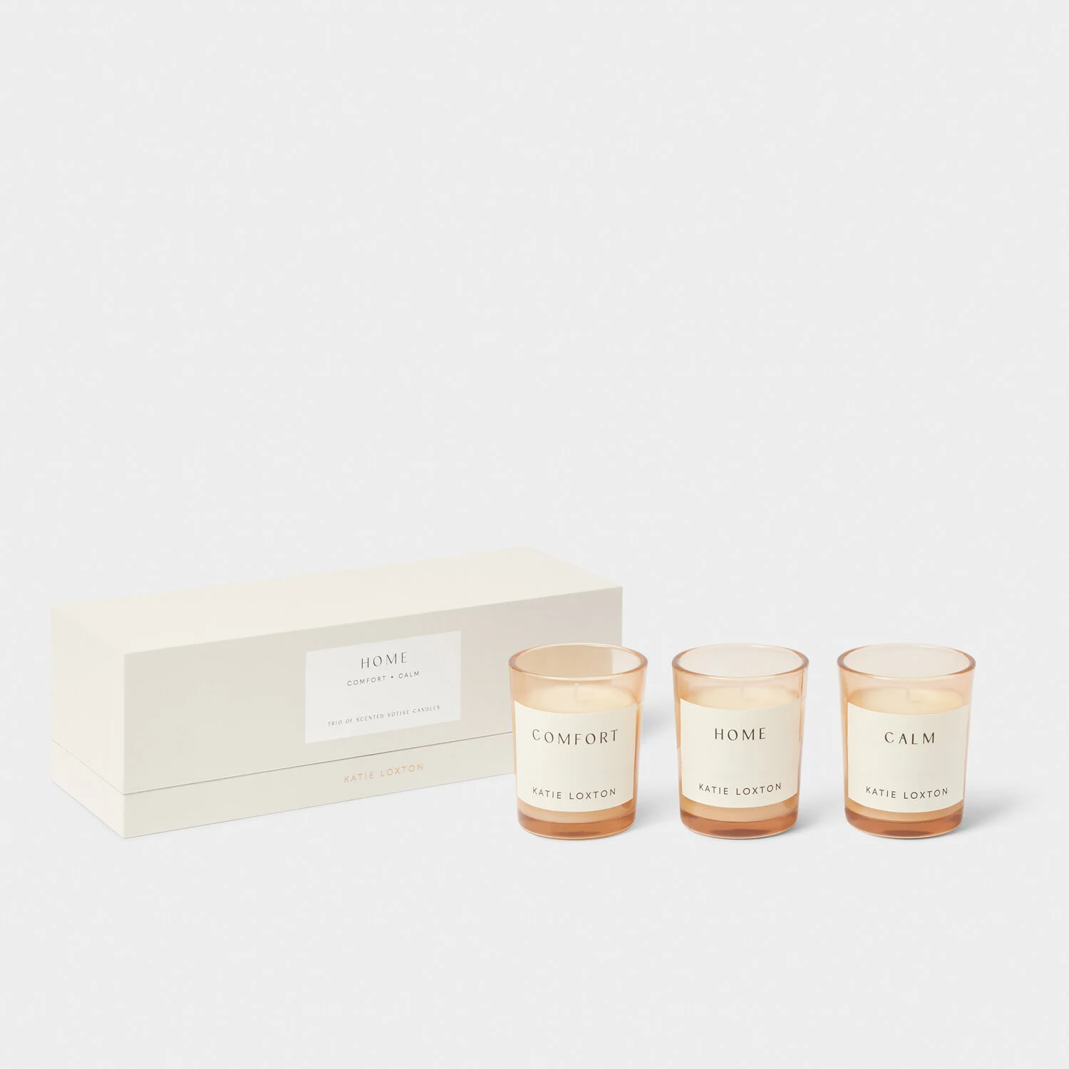 his ensemble of three scented votive candles is sure to infuse a sense of relaxation into your favourite home spaces. Nestled within an elegant display box, each candle embodies a unique and heartfelt sentiment, including 'Home,' 'Comfort,' and 'Calm,' making it the perfect gift for any occasion.