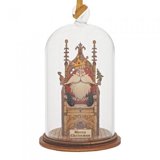 The Spirit of Christmas. A collection of delightful wooden decorations that capture the essence of that special time of year. This glass dome, Christmas decoration encases a festive Santa, adorned with royal throne and ribbon to help hang off your Christmas tree. This classic vintage style, decorative Kloche will make a stunning display in your home. Material: Glass with a wooden base. Packaging: Presented in a branded unique giftbox.