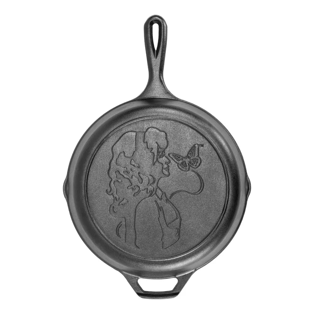 This skillet celebrates all the ways that Dolly inspires us to let our spirits soar. Inspired by the Tennessee icon herself, this cast iron skillet features a profile view of Dolly looking at a butterfly in flight.