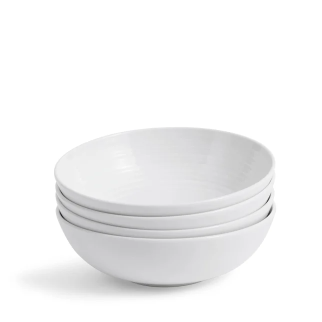 The white Maze dinnerware collection by Gordon Ramsay is contemporary and stylish, yet durable enough for everyday use. This set of four 18cm bowls come rendered in a subtle white glaze and decorated with embossed concentric circles that attract the eye towards the center of the dish; accentuating the appetizing appeal of whatever you choose to serve on it.