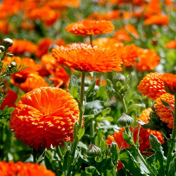 A splendid variety of calendula with enormous orange flowers, perfectly double and beautifully formed. This is the strain which is now grown for cut-flowers. Height 45cm (18"). HA - Hardy annual. Heritage seed variety.