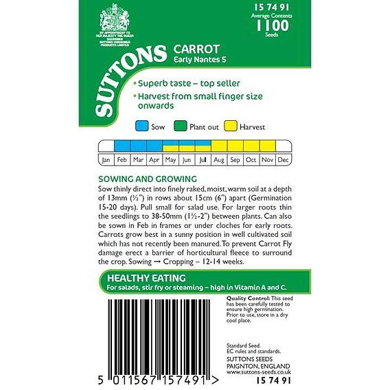 Sow thinly direct into finely raked, moist, warm soil at a depth of 13mm (½") in rows about 15cm (6") apart. Germination 15-20 days. Pull small carrots for salad use. For larger roots thin the seedlings to 38-50mm (1½-2") between plants. Can also be sown in February in frames or under cloches for early roots. Carrots grow best in a sunny position in well cultivated soil which has not recently been manured. To prevent Carrot Fly damage erect a barrier of horticultural fleece to surround the crop. Sowing - cropping: 12-14 weeks.