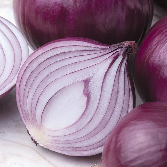 A first-class, deliciously flavoured onion with a good strong red colour, both inside and out. The bulbs are a very uniform round to globe shape, with thin necks, show good tolerance to mildew, and store well.