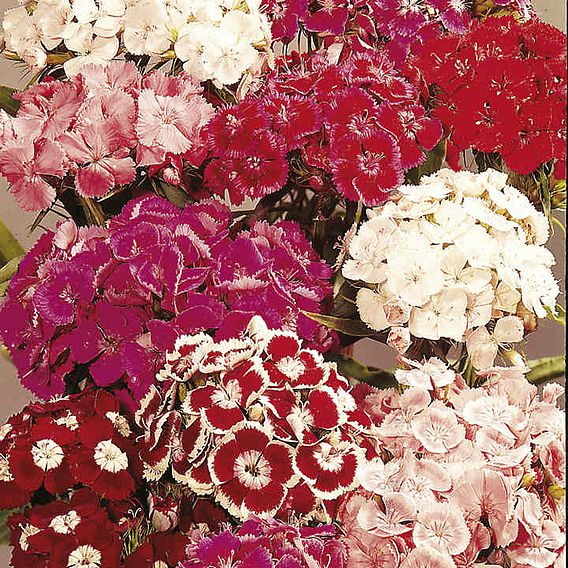A first-class sweet william producing lots of flowers in a bright range of traditional colours. Springtime fragrance. Clustered heads of very fragrant single flowers in attractive self-colours and combinations. Good cut flowers with long firm stems. HB - Hardy biennial. Height 45cm (18").