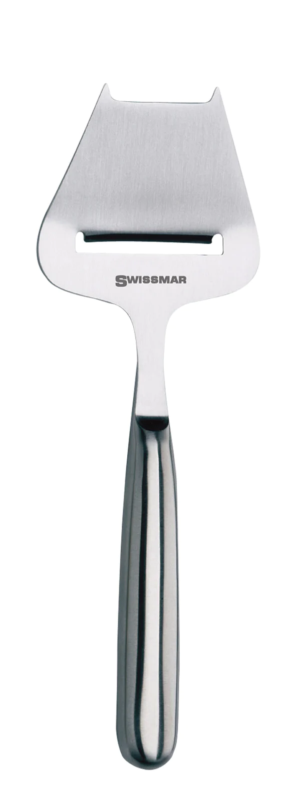 Cheese plane is perfect for slicing cheddar, swiss, or monterey jack, but can easily slice through most cheeses